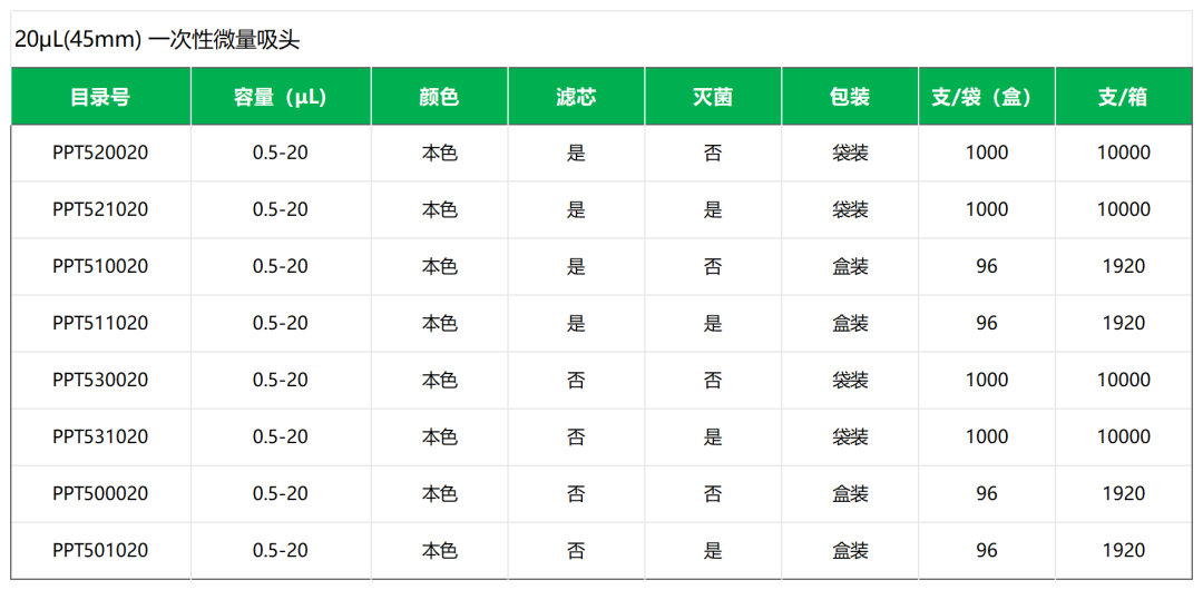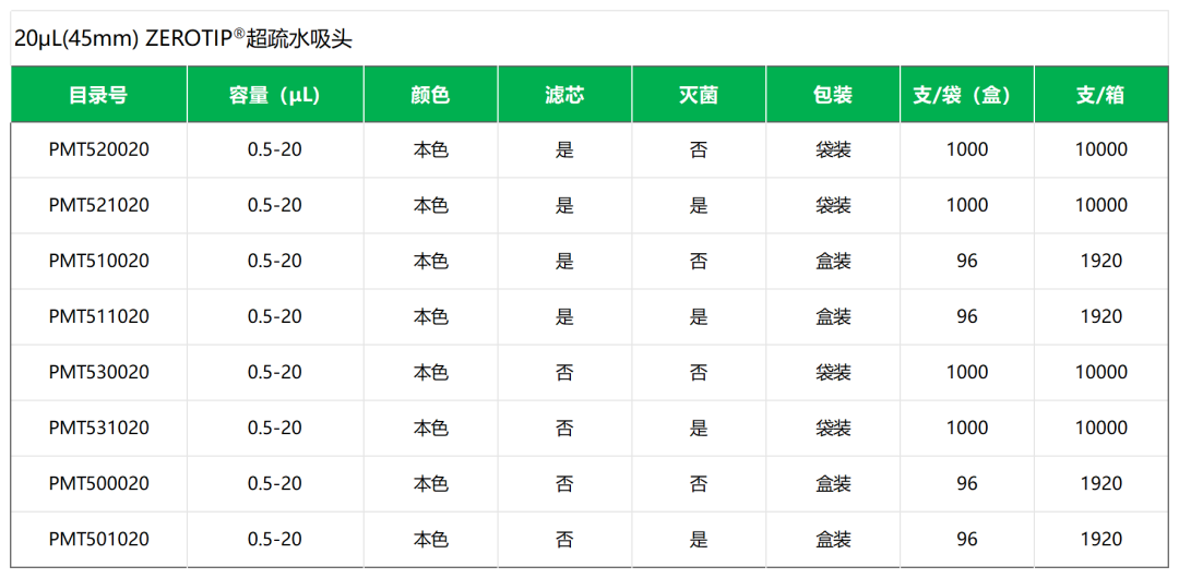 小洁:20μL(45 mm)吸头和20μL(51 mm)吸头一样,有普通吸头和ZEROTIP®超疏水吸头两类吗?
